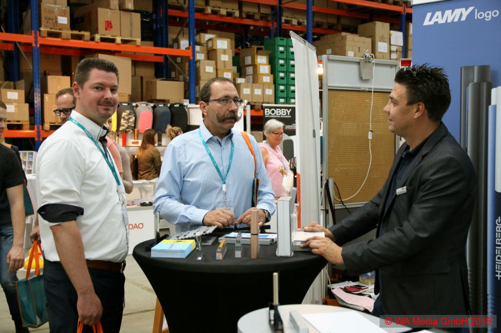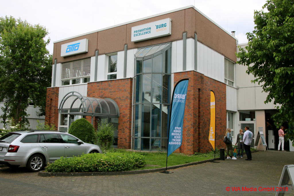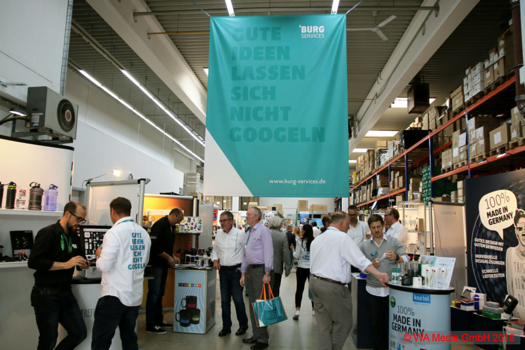 Nach der Premiere im vergangenen Jahr lud Burg Services seine Kunden am 24. Mai 2018 erneut in den Unternehmenssitz nach Köln ein, um Marketingentscheidern und Einkäufern aus der Industrie in Zusammenarbeit mit 17 Ausstellern die Möglichkeiten haptischer Werbung aufzuzeigen. Im zur „Erlebnisarena“ umfunktionierten Lager stellten die Lieferantenpartner ihr Portfolio unter verschiedenen Headlines vor, die das Interesse an den Sortimenten weckten – darunter „Quietschvergnügt“, „Bürooptimierer“, „Hören Sie selbst“ oder „Trag deinen Brand“. Auch das Unternehmensmotto von Burg Services – „Gute Ideen lassen sich nicht googeln“ – wurde, wie auch bei der Auftaktveranstaltung in 2017, prominent in Szene gesetzt. Der Spruch prangte auf einem großen Banner im Eingangsbereich der Ausstellungshalle, lenkte den Blick auf die Rückseite der Teamhemden und war auf die Taschen gedruckt, die den Gästen am Eingang überreicht wurden.