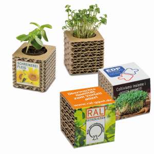 Nachhaltiger Werbebotschafter: der Wellkarton-Pflanzwürfel der Marke emotion factory.