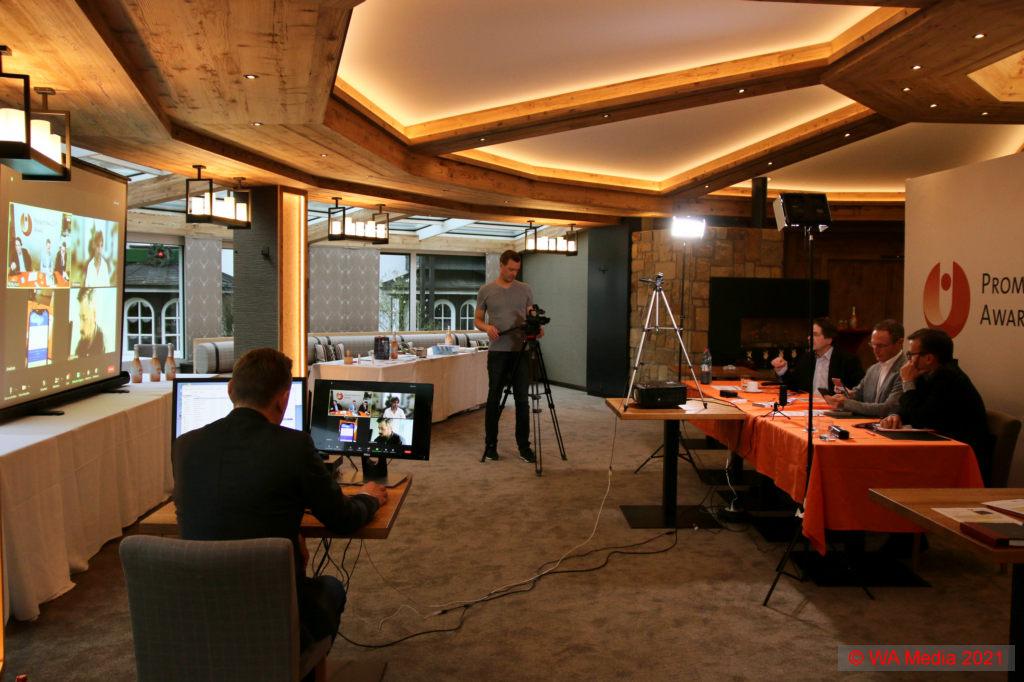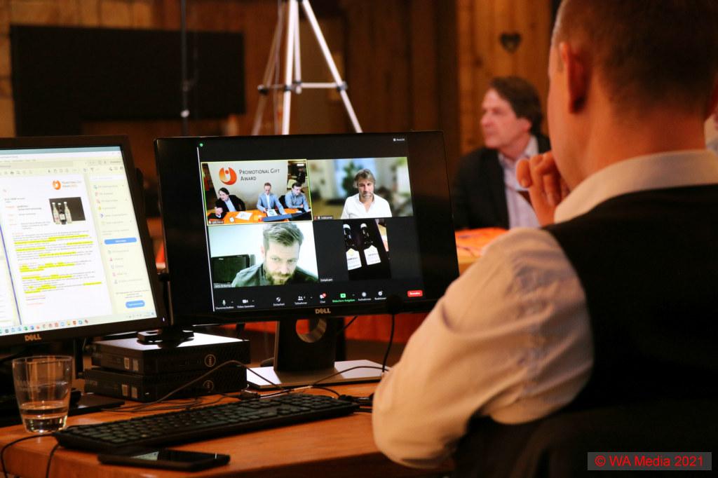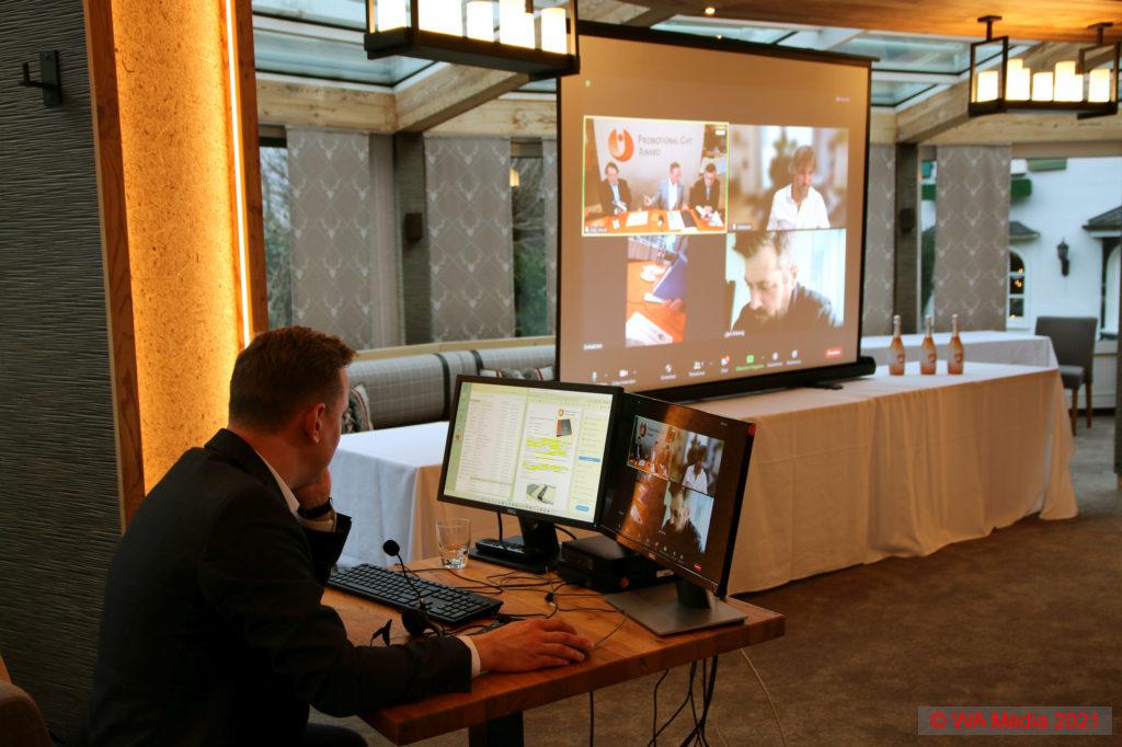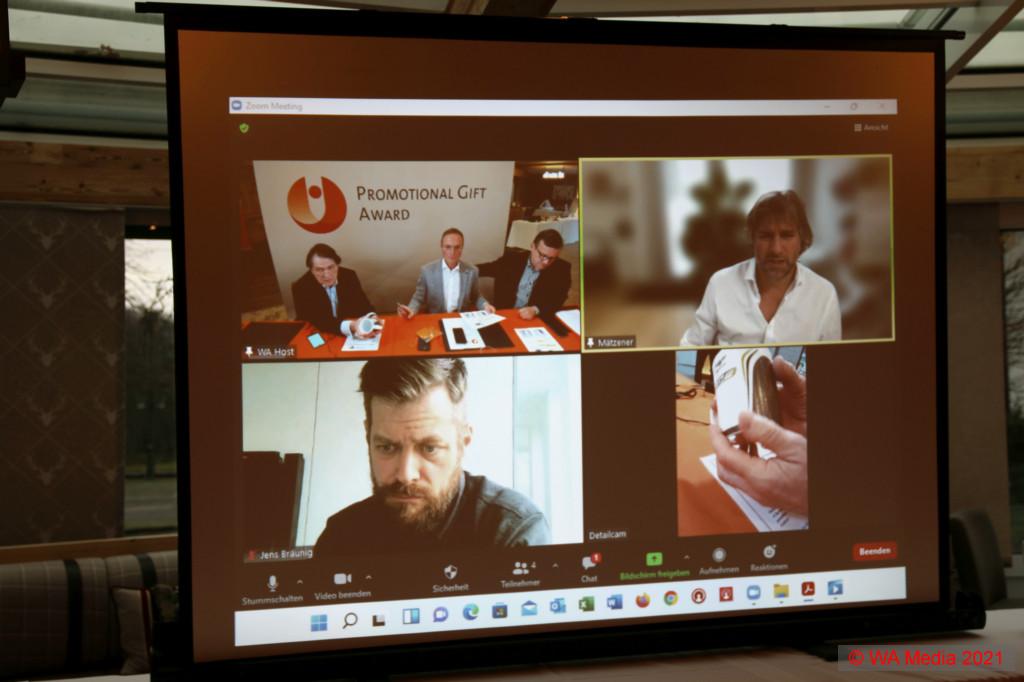 Die Jury des Promotional Gift Award 2022 nach Abschluss der erstmals hybrid durchgeführten Bewertungsphase mit einigen der Gewinnerprodukte (v.l.): Michael Mätzener (diewerbeartikel gmbh), Michael Witzorrek (Fendt), Michael Scherer (WA Media), Martin Zettl (markeding) und Jens Bräunig (VfB Stuttgart).
