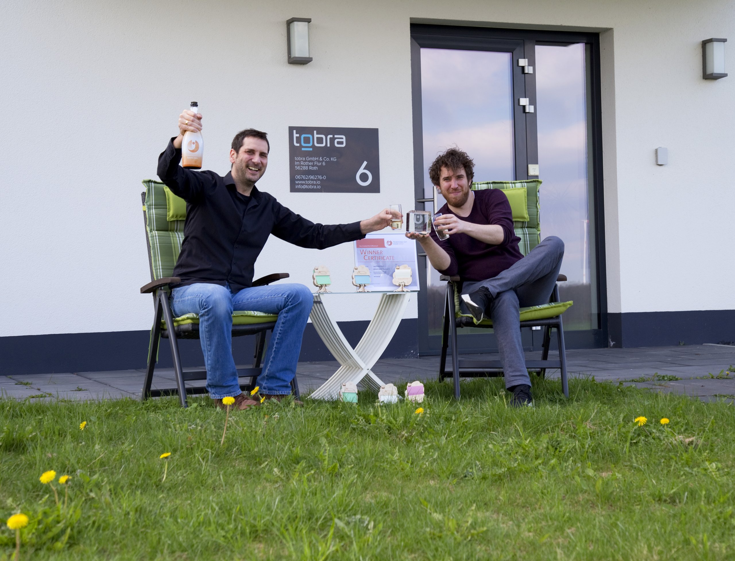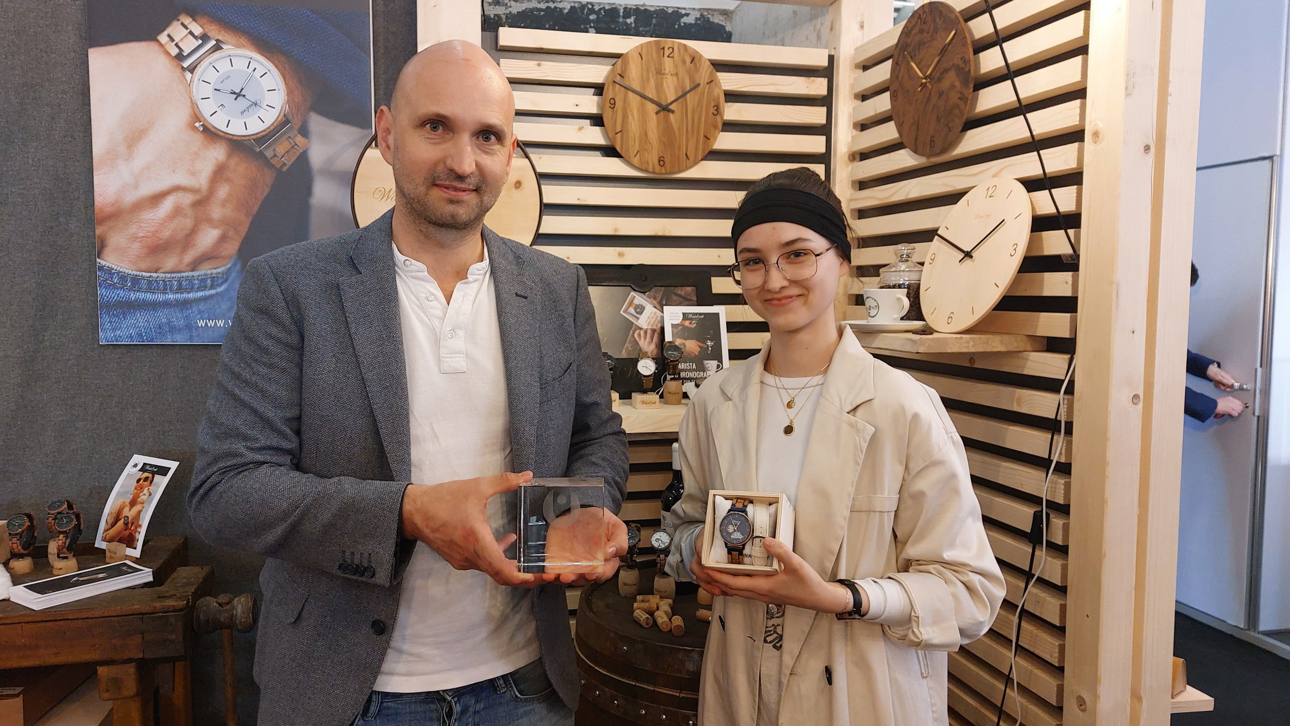 Macht Eindruck: Mit dem Growbook aus Kiefernholz würdigen Allroundtalent Martin Fehr (v.l.), Mediengestalterin Nadine Neuberger und Geschäftsführer Stefan Bittel von Eindruck e. K. den Kiefernbaum als beliebten Rohstofflieferanten und feiern ihre Auszeichnung im ganz großen Stil.