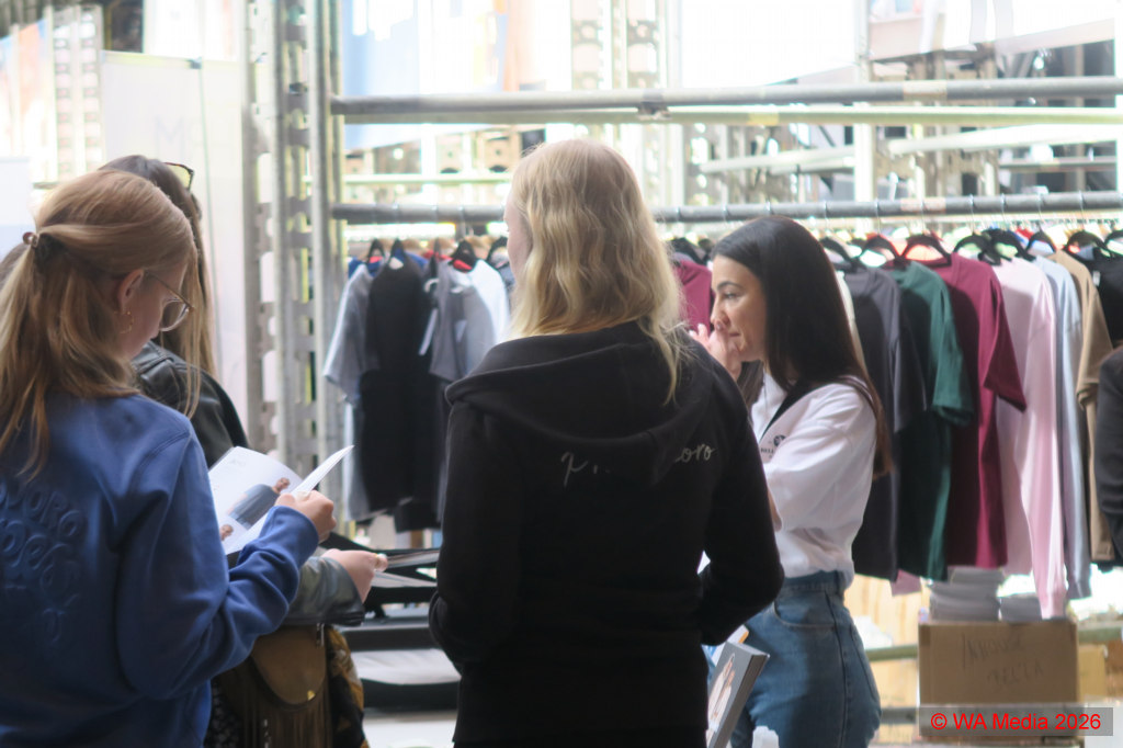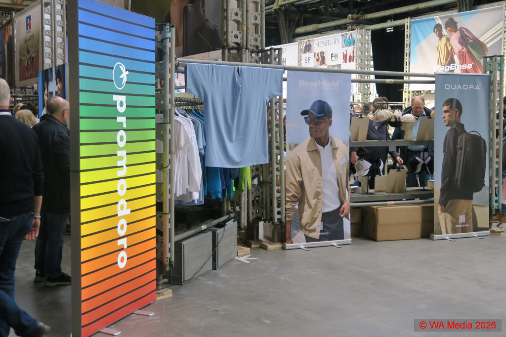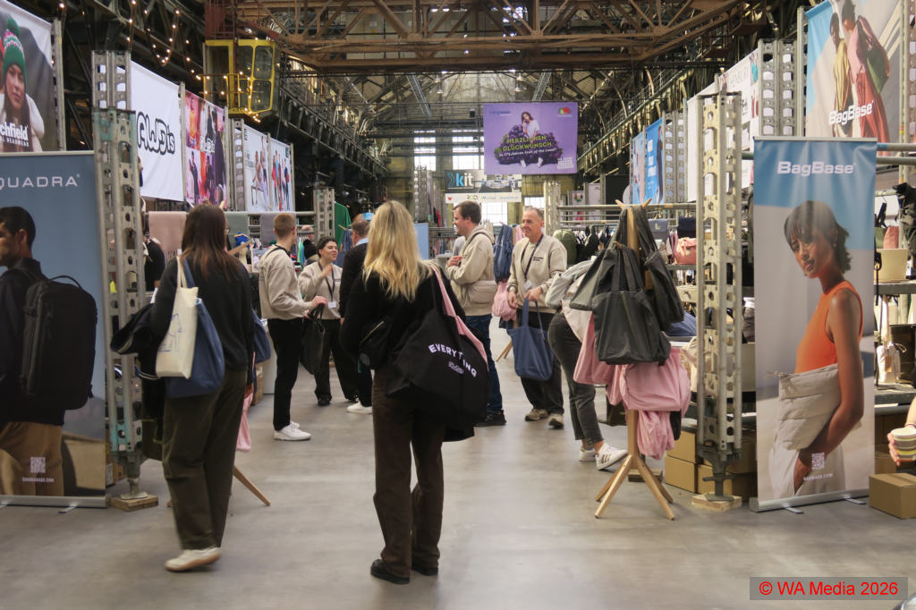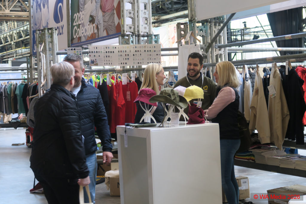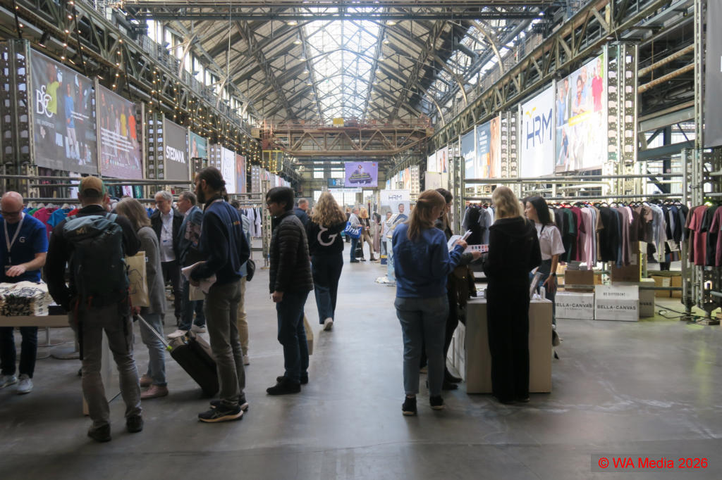 Die großzügige, lichtdurchflutete Halle bot im vorderen Bereich ausreichend Platz für die Textilspezialisten, die Hoodies, T-Shirts, Sweatshirts, aber auch Babykleidung sowie Sicherheitskleidung oder Berufsbekleidung präsentierten. Neben Kleidung fanden sich auch Hersteller von Accessoires wie Taschen, Mützen, Schals oder Regenschirme, und auch der Bereich Plüschtiere wurde abgedeckt, sodass alle Möglichkeiten der Textilbranche repräsentiert wurden.